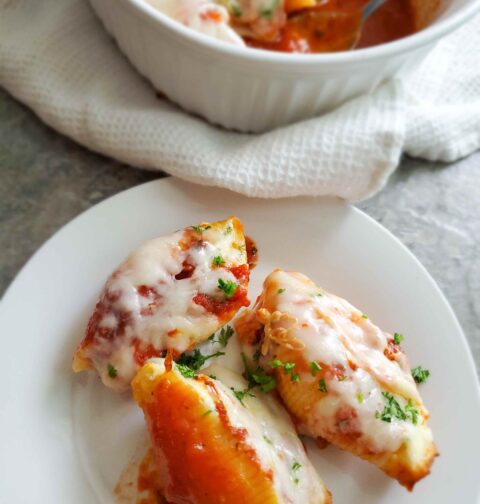 These delicious Jumbo shells are filled with cheese, chicken, and herbs and baked with marinara and more cheese on the top. Cheesy heaven for cheese lovers.