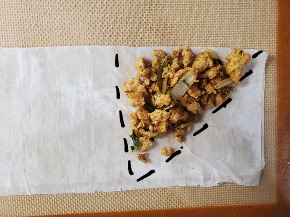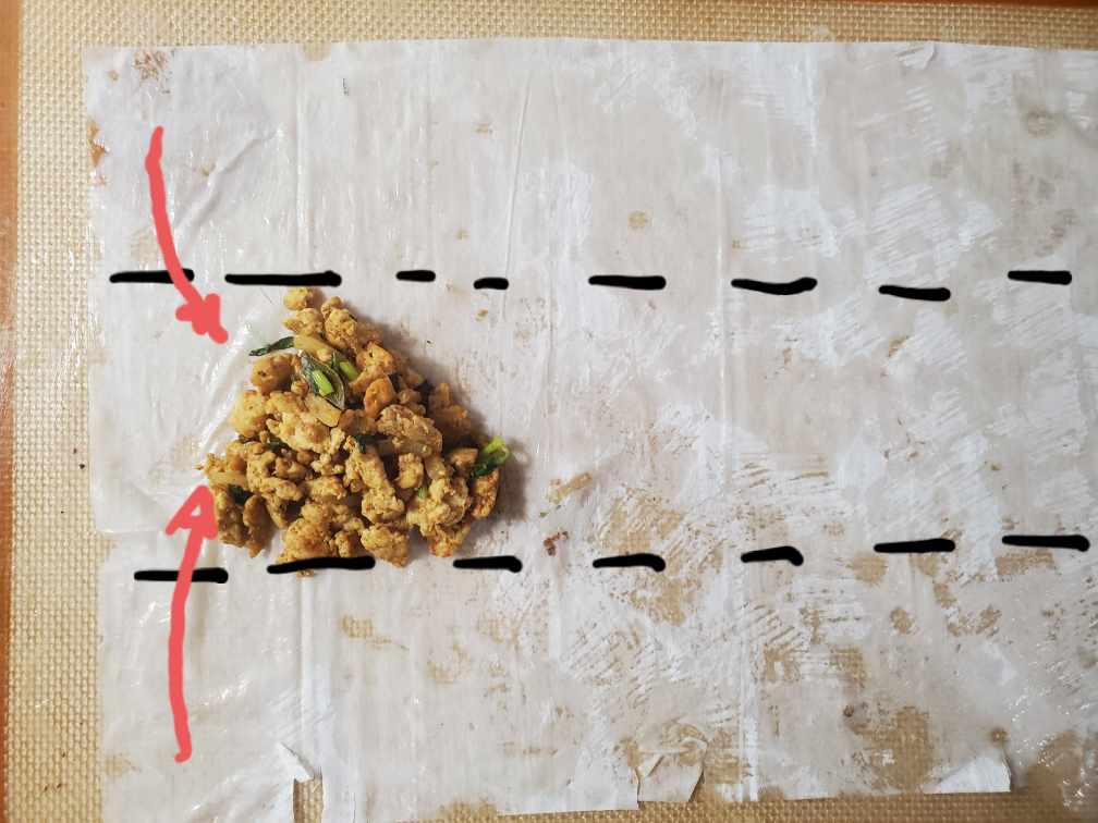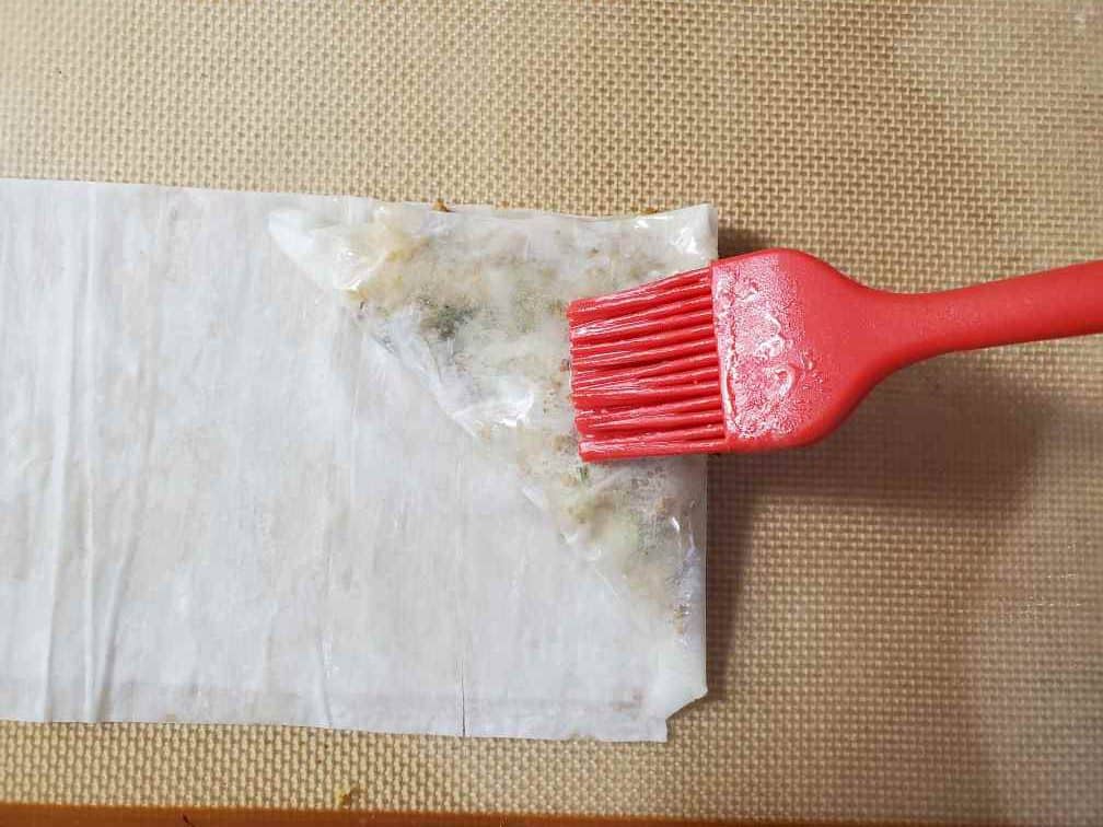 Take one phyllo sheet out. Keep the rest of the phyllo sheets covered with a lightly damped towel. Fold the phyllo sheet in half. Carefully apply melted butter to the whole folded sheet using a pastry brush. Then put some filling in as shown in the photo. Fold the sheet along the right black line (in the photo) to cover the filling.