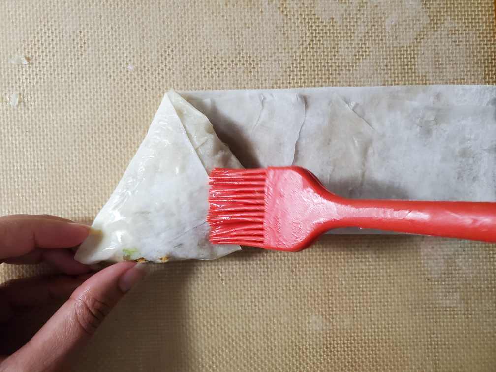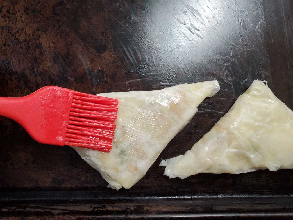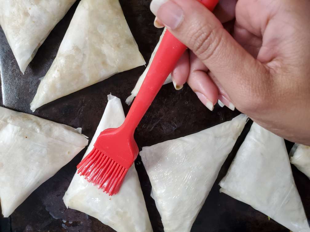 Place the folded samosas on an oiled baking sheet. Brush the samosa with melted butter.