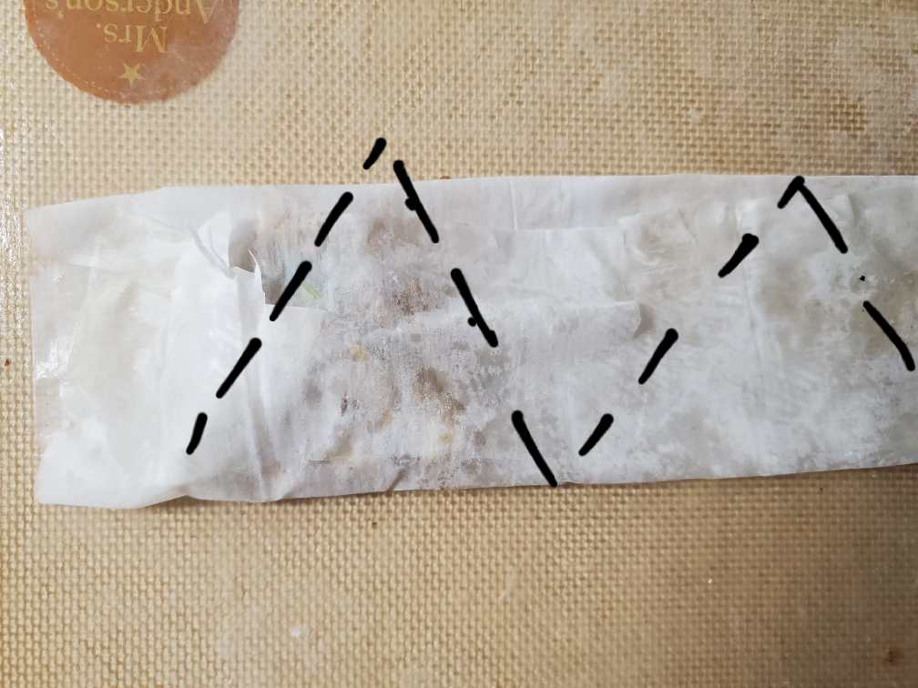 Fold the left corner along the left black line. Apply some butter. Then keep folding along the black lines that I have drawn in the photo. You can use this folding method to make samosas that have equal sides.
