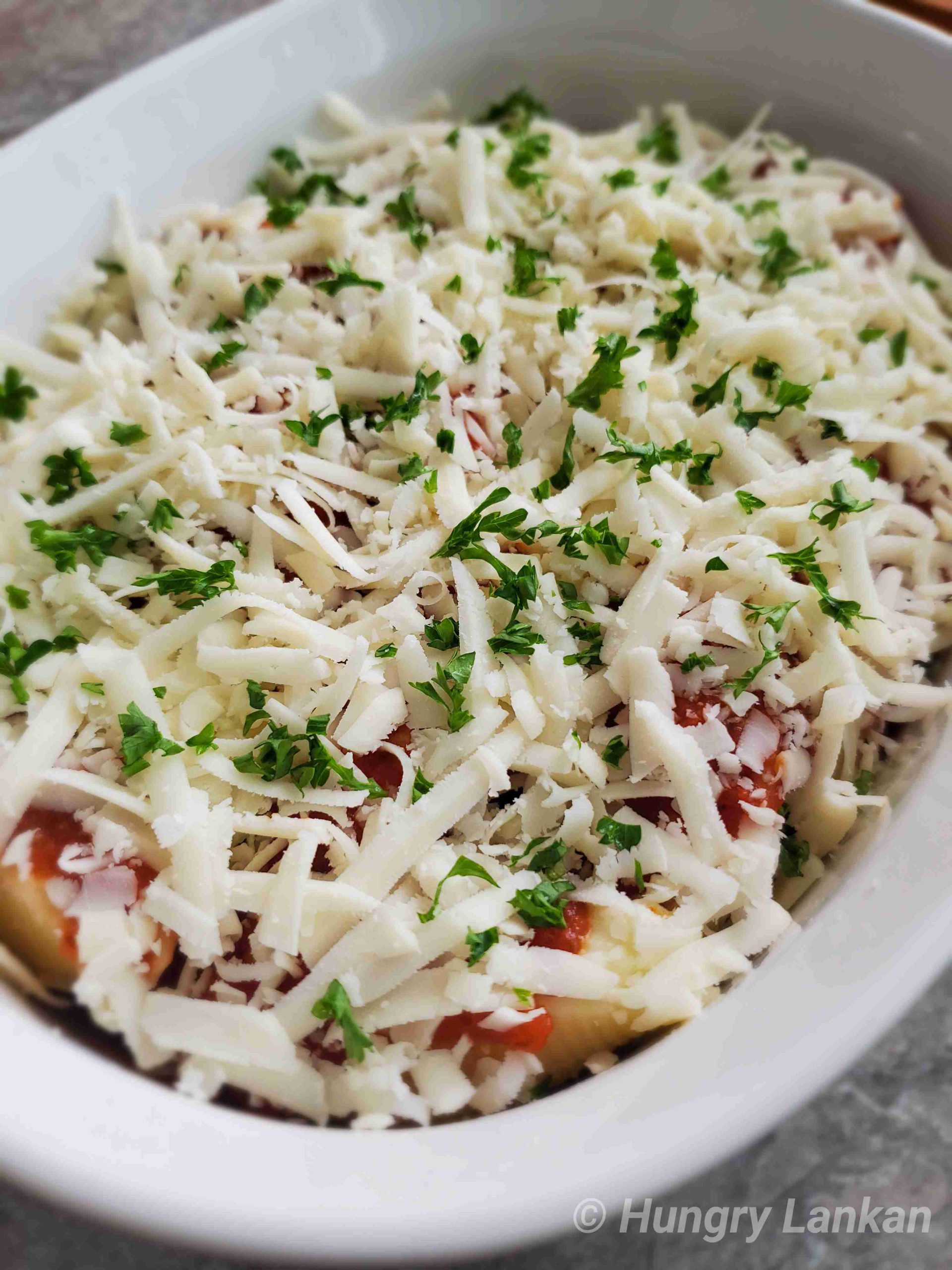 4. Now top with the rest of the marinara sauce. Top with grated mozzarella and sprinkle some chopped parsley.