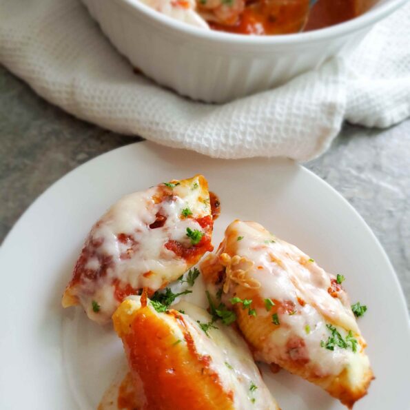 These delicious Jumbo shells are filled with cheese, chicken, and herbs and baked with marinara and more cheese on the top. Cheesy heaven for cheese lovers.