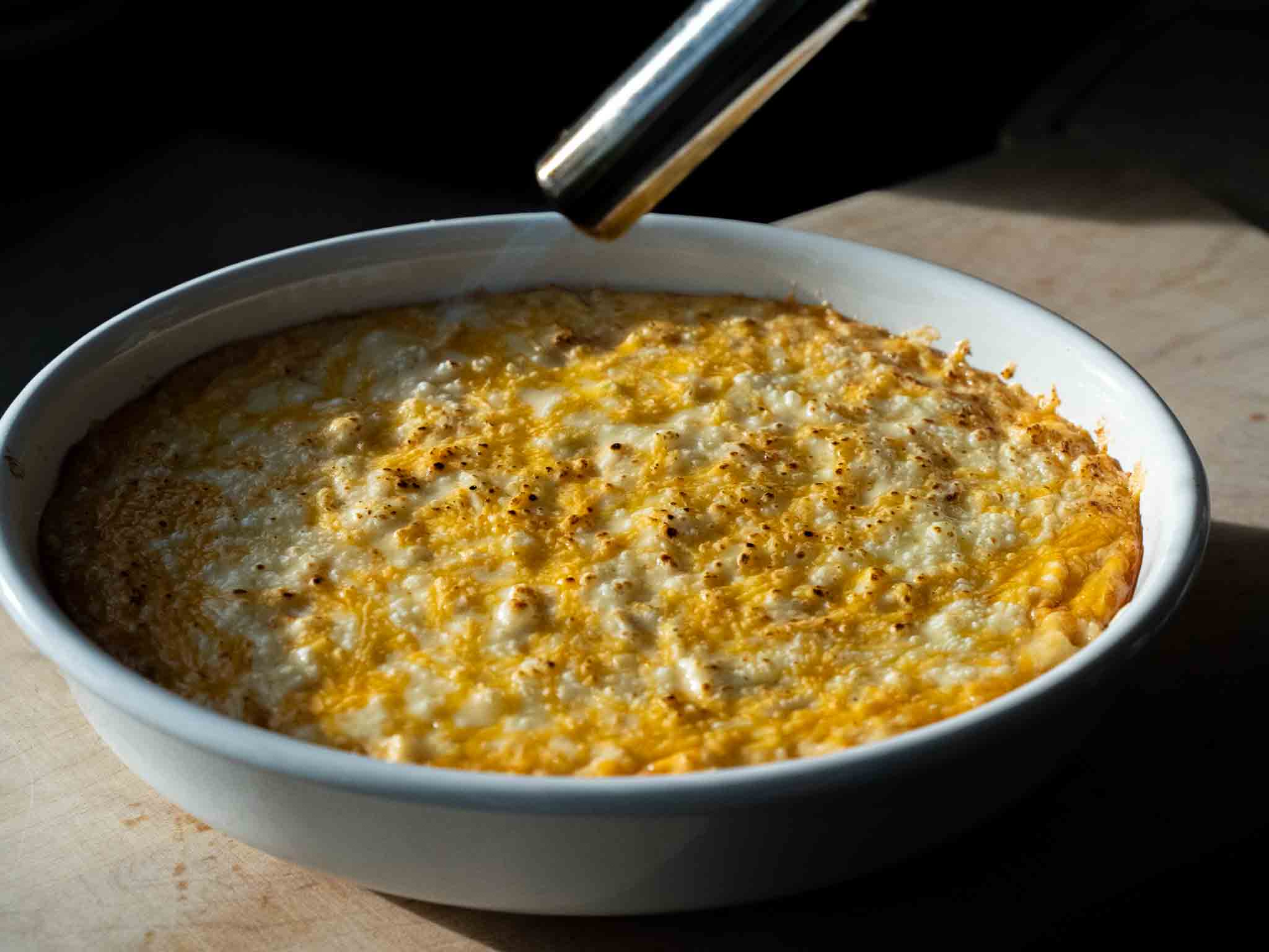 When the time is up, take the dip out. Blow Torch the top until you see small dark brown spots. If you don't have a blow torch, broil the dip on high for 1 minute.