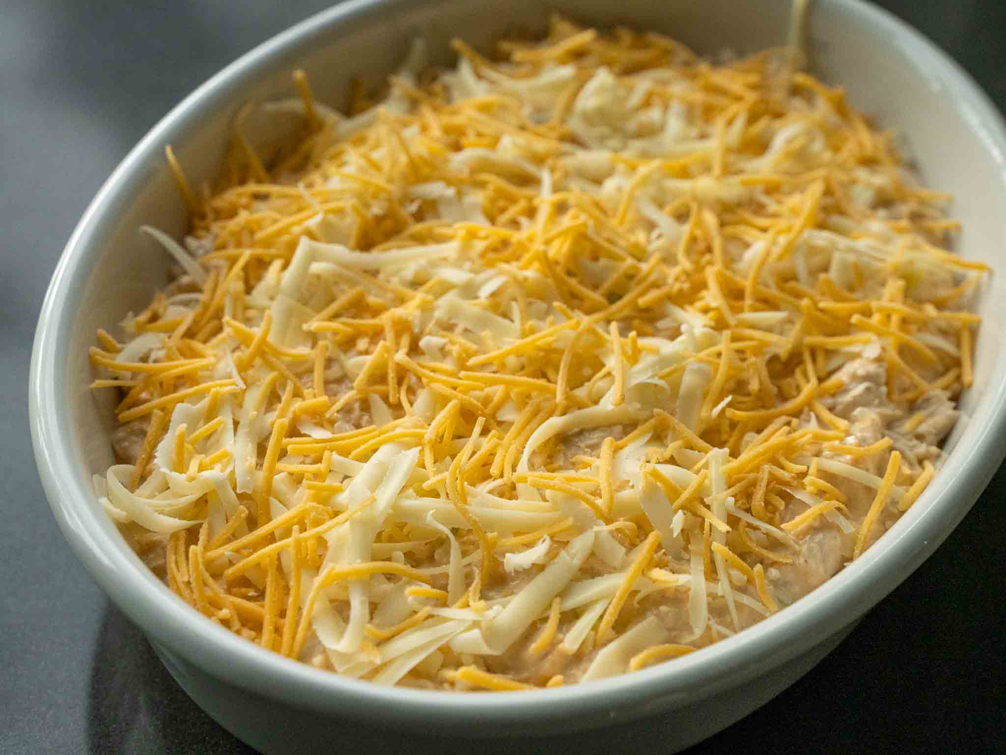 Transfer to a baking tray. Top with gruyere and cheddar cheese. Bake for 25 minutes at 350F.