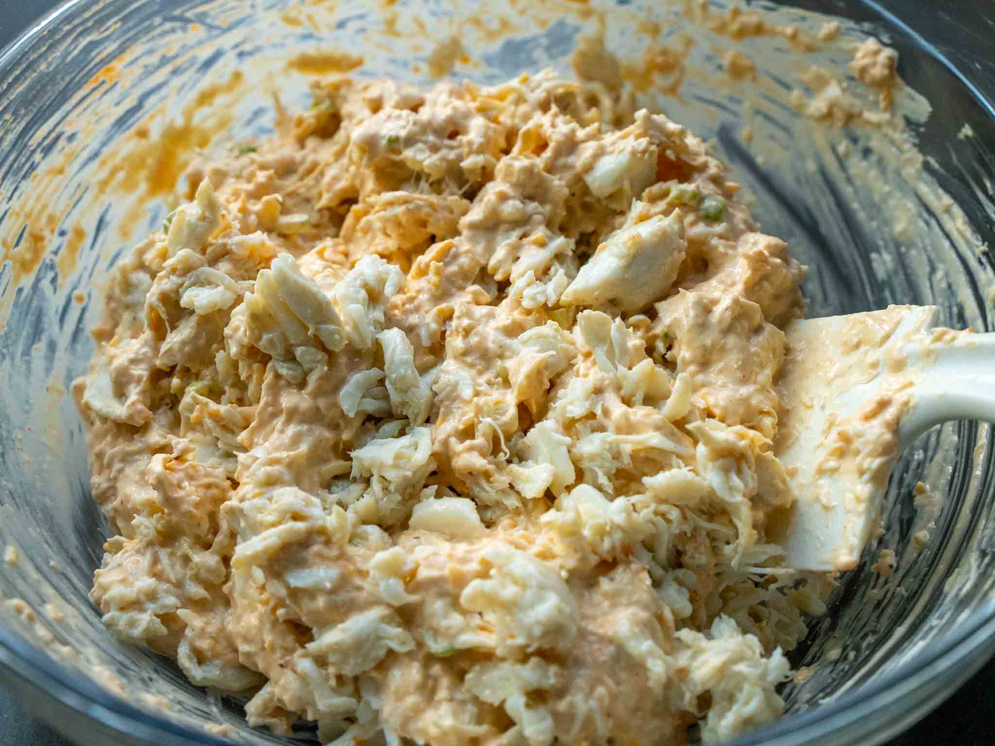 Add the lump crab meat to the bowl (if there's any liquid with the crab meat, make sure to remove it). Fold with the rest of the mixture.