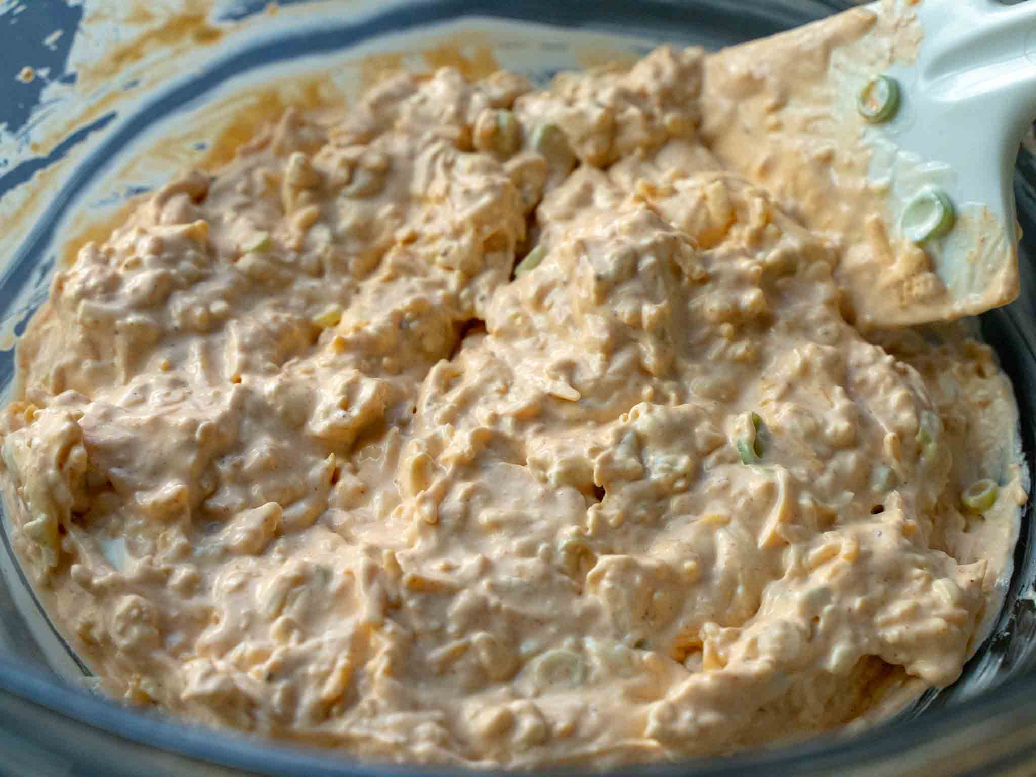 Microwave the cream cheese block for 30 seconds to soften it up (or leave it on the counter for 30 - 60 minutes until it softens). Add to a large mixing bowl, along with sour cream, mayonnaise, 2 oz gruyere cheese, 2 oz cheddar cheese, sriracha, Worcestershire sauce, Old Bay seasoning, garlic, and spring onions. Mix well until everything is combined.