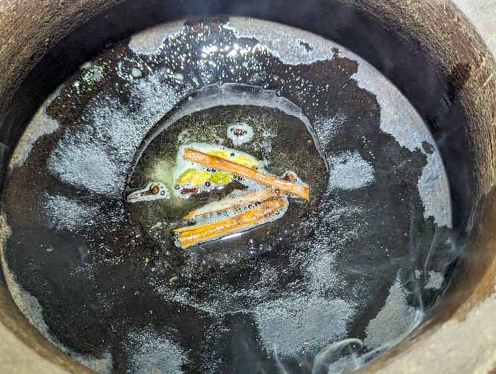 Heat oil in a clay pot/heavy bottom pot. Add cinnamon, cardamom, and cloves. Let them fry in oil for about 5 seconds.