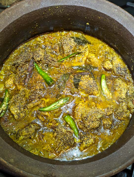 Finally, add the green chilies, sprinkle black pepper on top to garnish, and cover with the lid. This will make the oil float on top which makes the curry look very appealing.