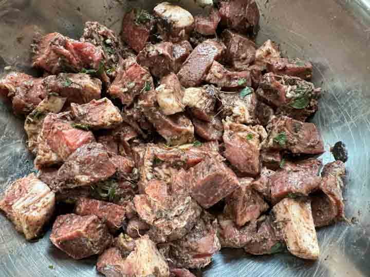 3. Add goraka paste, spices & ginger garlic paste, and salt to your pork pieces. Mix it well and set it aside.