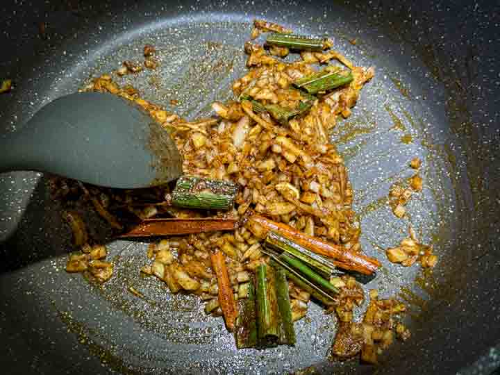1. Heat Oil to medium heat. Add Cinnamon. When they start to sizzle, add curry powder, chili powder and salt. Saute for a few seconds until the curry powder turns deeper in color. Then add onions and pandan leaves. Mix well.