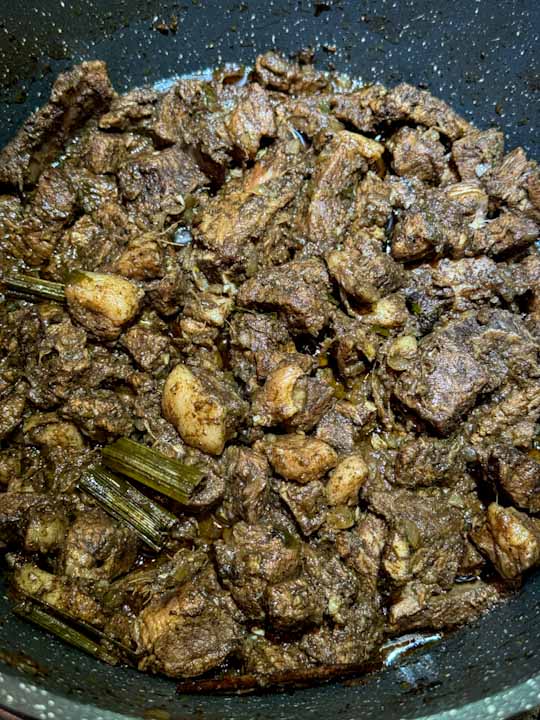 Cooking it low and slow: Black pork curry needs a longer cooking time in low heat to get the meat tender. I usually cook it for atleast an hour or until the meat pieces become tender enough that I can break it apart with my fingers. Low and slow cooking helps to get the curry look darker in color too.