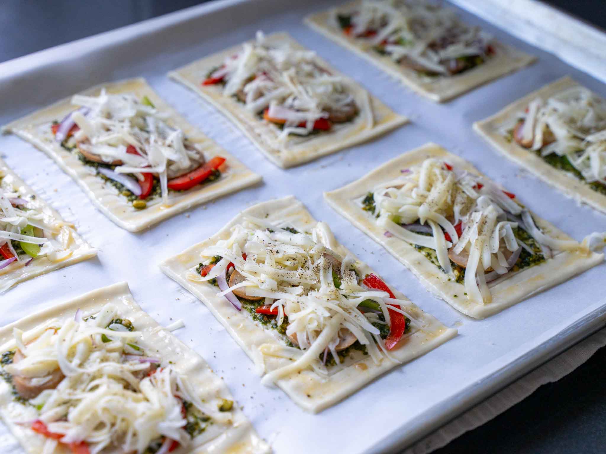 7. Spread pesto in the middle of each puff pastry. Then top with a few sausage slices, a few pepper slices, and a few onion slices. Top with 2 - 3 tbsp of shredded cheese. Sprinkle some pepper on top of each.