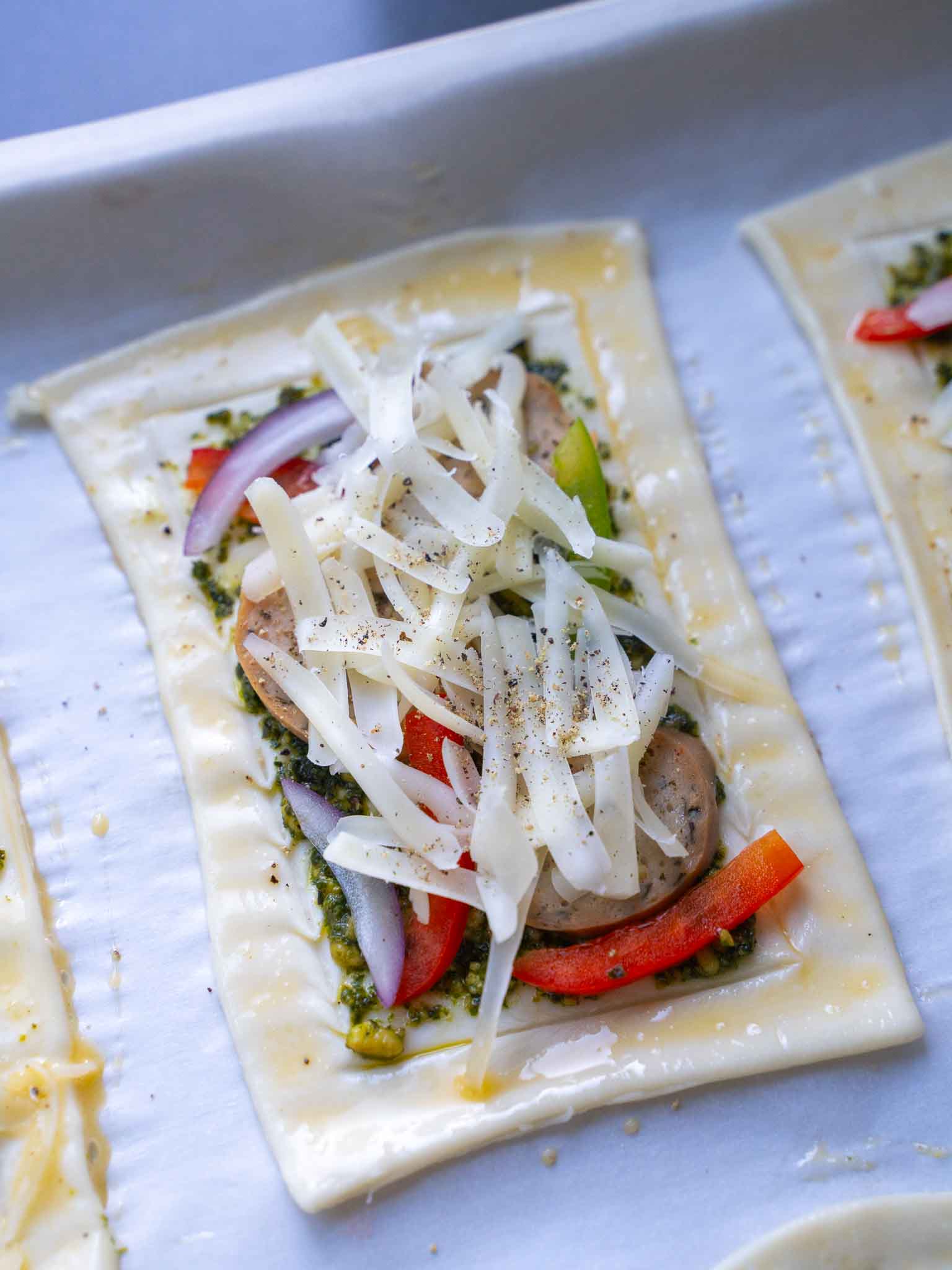 Spread pesto in the middle of each puff pastry. Then top with a few sausage slices, a few pepper slices, and a few onion slices. Top with 2 - 3 tbsp of shredded cheese. Sprinkle some pepper on top of each.
