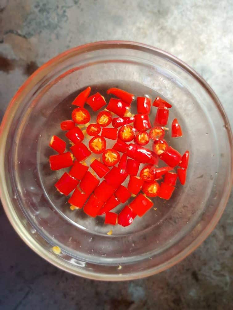Cut the Thai chilies into small 1 cm pieces. You can use either red or green or a mix of both. Add the chilies into vinegar and salt mixture and leave it for about ½ hour or longer. You can use pickled chilies if you already have them in hand. This prevents the chilies from burning when you add them to the wok. And also adds flavor.