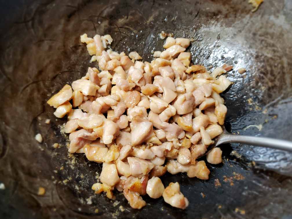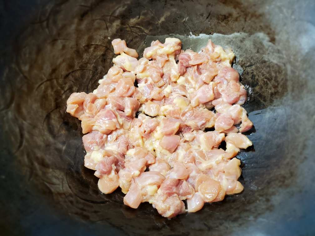 Heat the wok. And then add about a tbsp of oil. Let it heat. Add your chicken and spread it evenly. Cook on very high heat for about 30 sec to a minute without flipping. And then flip the chicken and let it cook until it's done all the way through. Make sure every piece of chicken touches the bottom of the wok and cook on very high heat so you won't see any liquid oozing out.