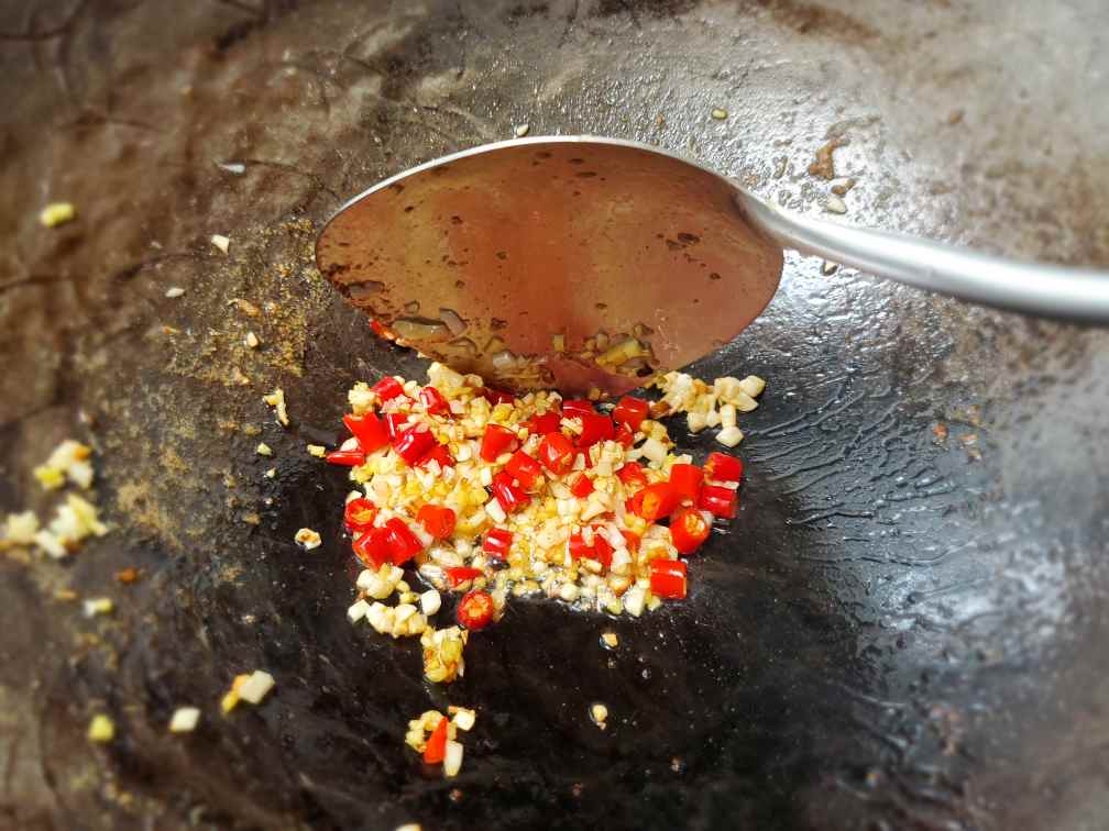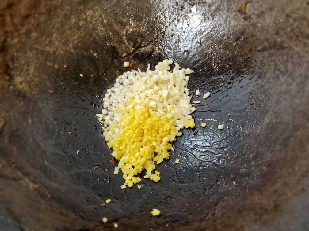 Add another tbsp of oil to the wok. Add your finely chopped ginger and garlic. Fry for a few seconds. Do not cook until the garlic turns brown.