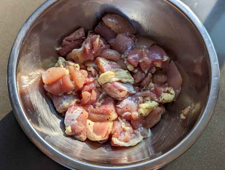 Season the chicken thigh pieces with salt and pepper.