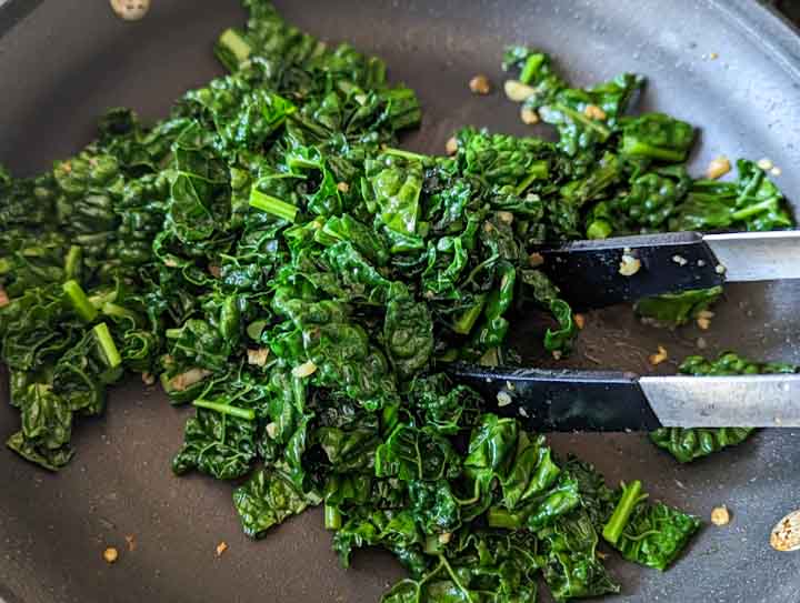 Add the chopped kale to the skillet and cook for about 3 - 5 minutes until it wilts and becomes tender.