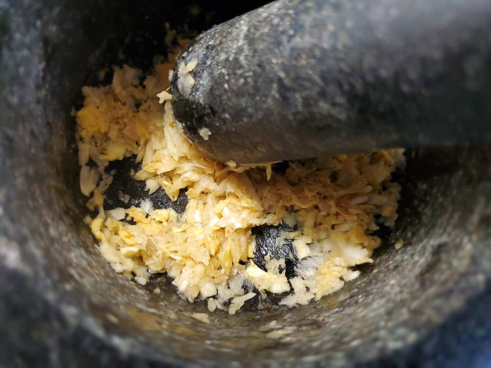 Crush your ginger and garlic to make a ginger-garlic paste (please do not use store-bought ginger garlic paste instead)