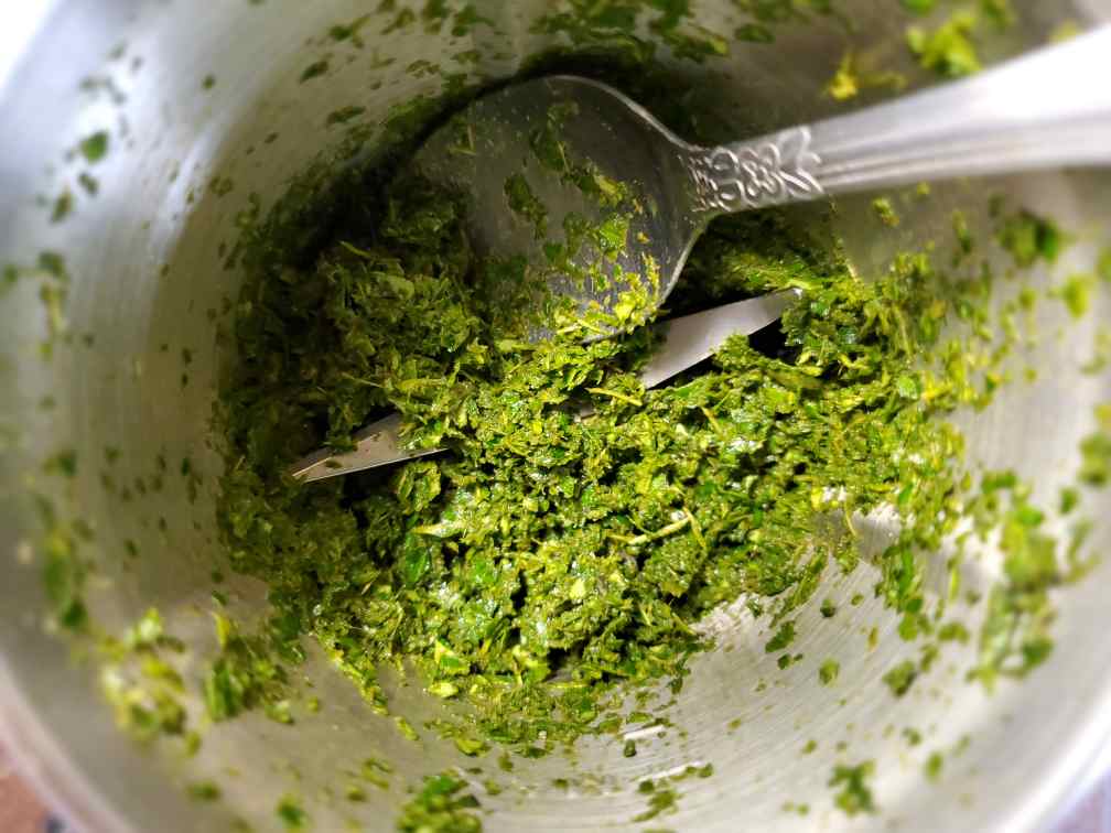 Add your curry leaves along with 1 tbsp of water and to your grinder cup or to the chopper and make a rough paste.