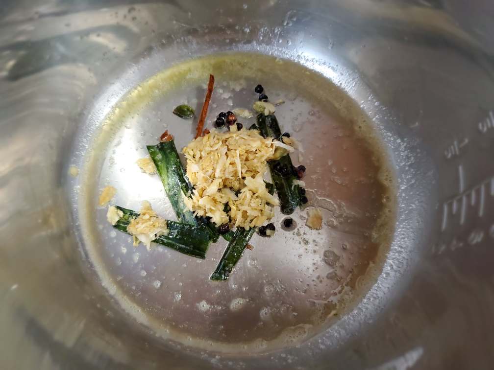 Heat your instant pot or rice cooker. Add 1 tbsp of butter. When the butter is melted add cardamom, cloves, black peppercorns, a cinnamon piece, broken pandan leaf, and saute for few seconds until aromatic.