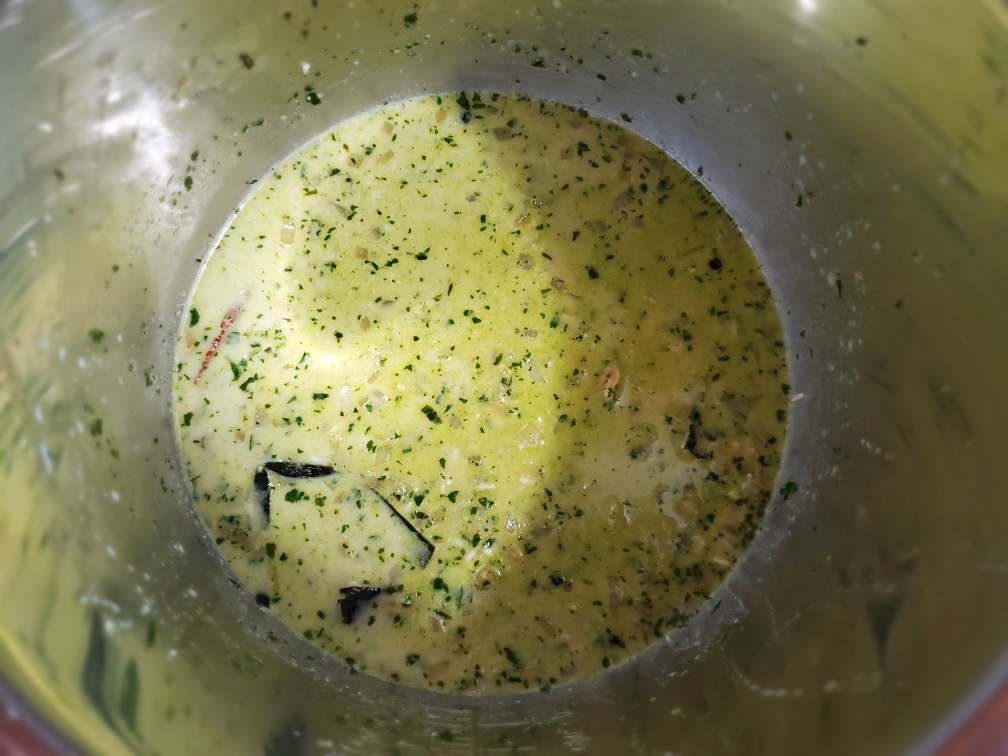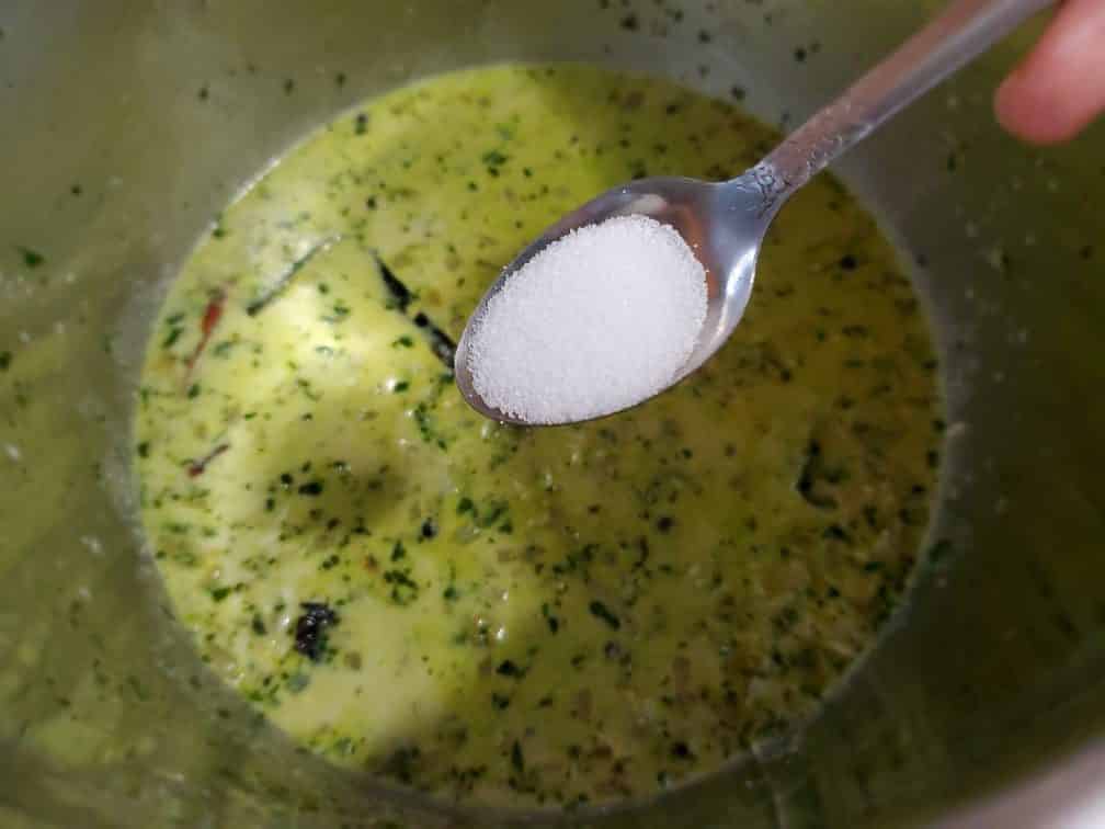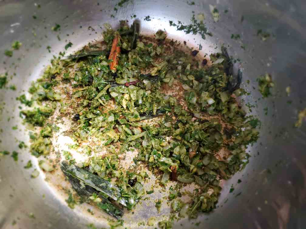 Then add the curry leaves paste. Mix well. Do not cook until they turn brown.
