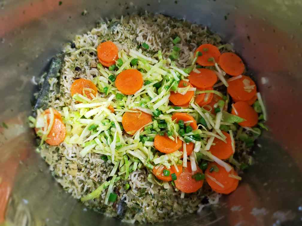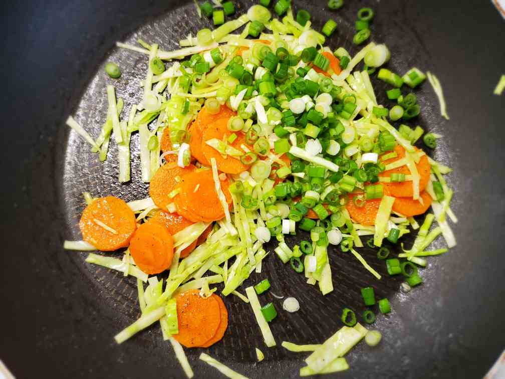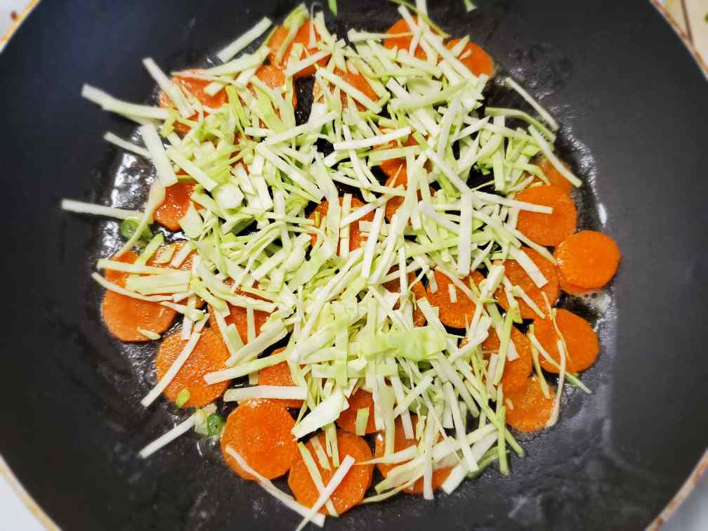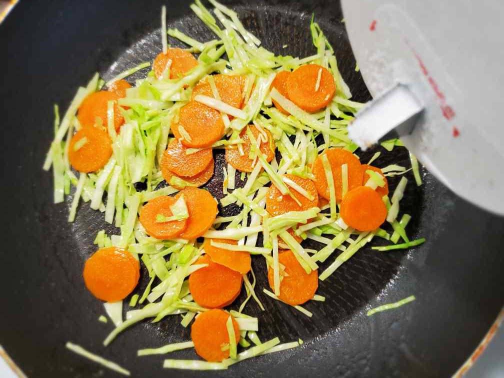 When carrots start to turn tender then add your cabbage. Saute for a few seconds. Do not cook until they turn mushy or brown.