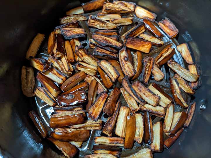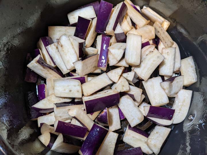Air-fry on 375F for 6 minutes. Flip eggplant pieces and air-fry for another 6 minutes or until eggplants turn brown on the outside and soft on the inside. Total of 10 - 12 minutes. (time may vary depending on the air-fryer. adjust the time accordingly).