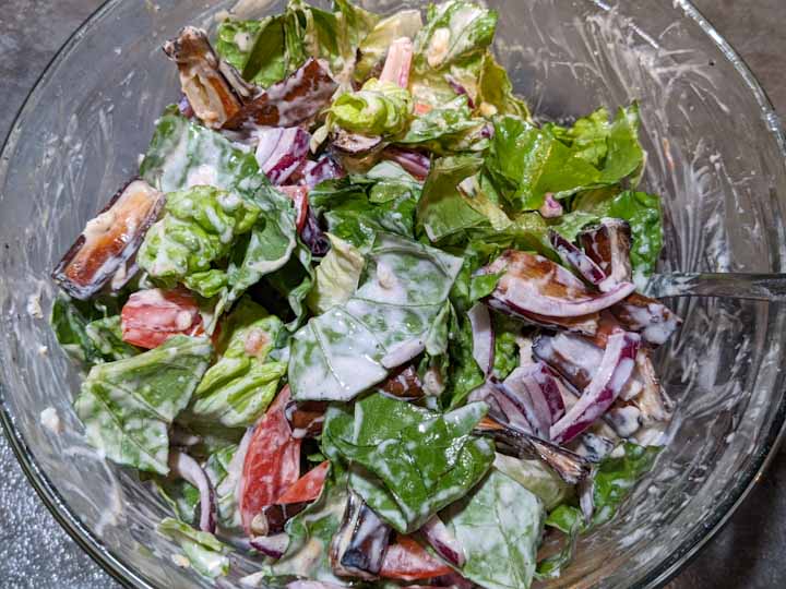 Air-fried Eggplant mixed with Lettuce, tomatoes, and onions and dressed with a yogurt-based zesty creamy dressing, this salad is definitely a keeper.