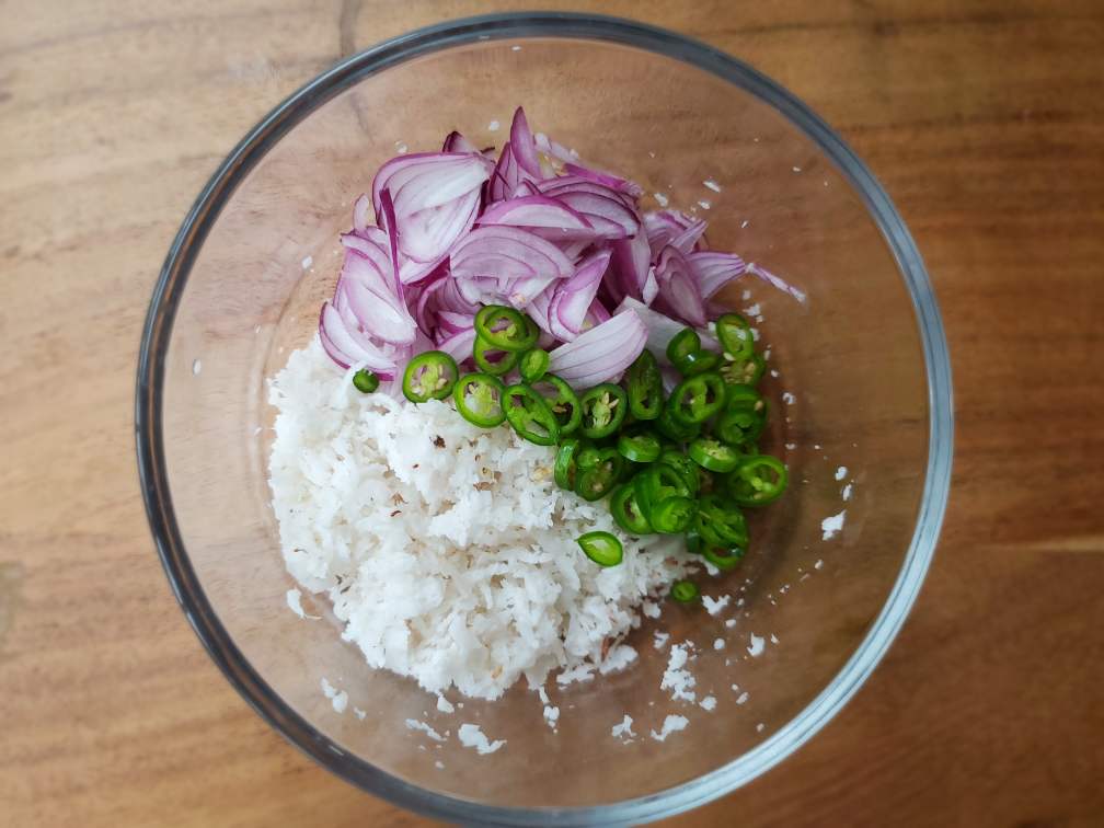 1. Add grated fresh coconut into a small bowl. Thinly slice pearl onions and green chili and add them to the same bowl.