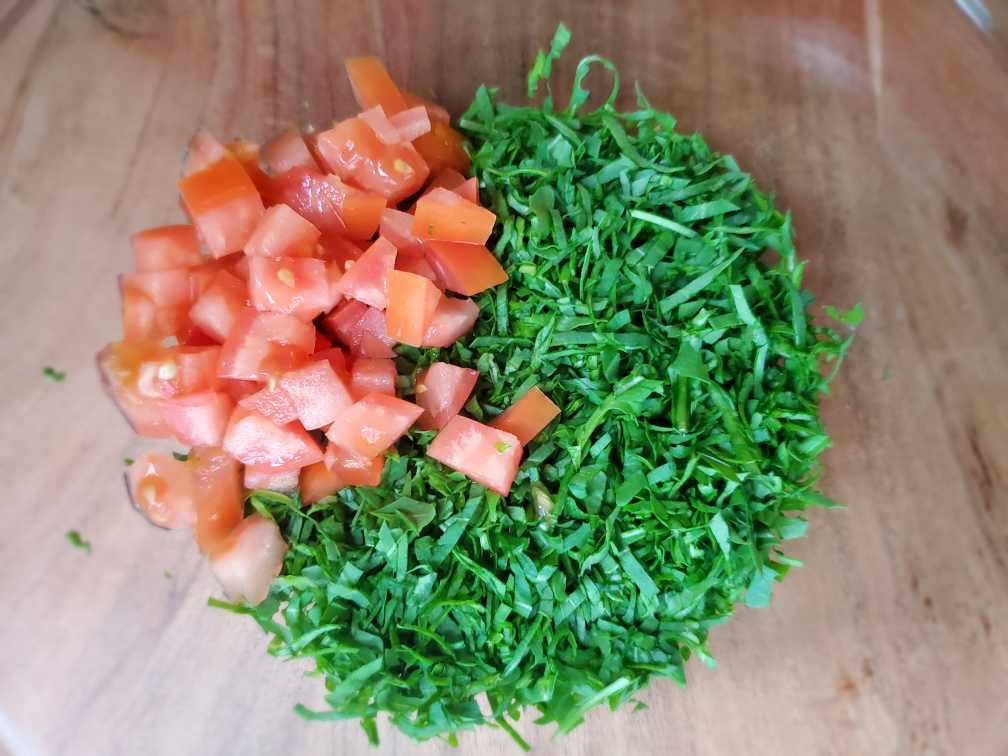 2. Slice Arugula leaves. Dice tomatoes. Add them to a separate bowl. (You can chop the Arugula too instead of slicing)