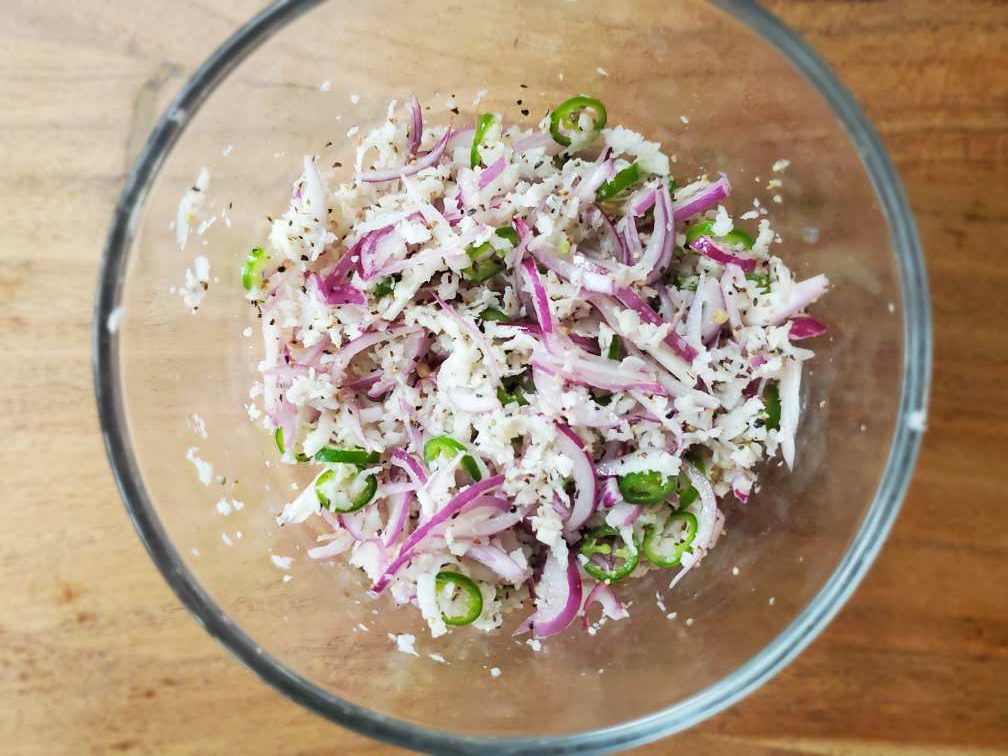 • Use your hands to mix coconut with shallots/onions, chilies, black pepper, like, and salt. Squeeze everything together with your fingers for better mixing.