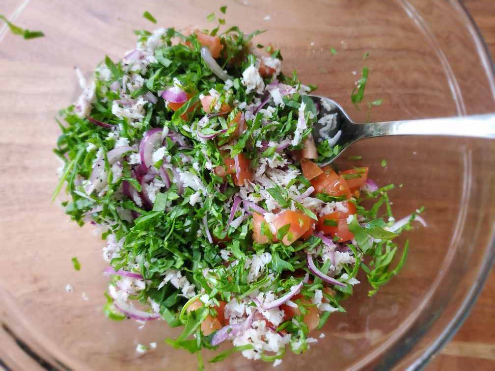 4. When you're ready to serve, add coconut mixture to the leaves and tomatoes. Gently mix everything. Taste and adjust seasonings if needed.