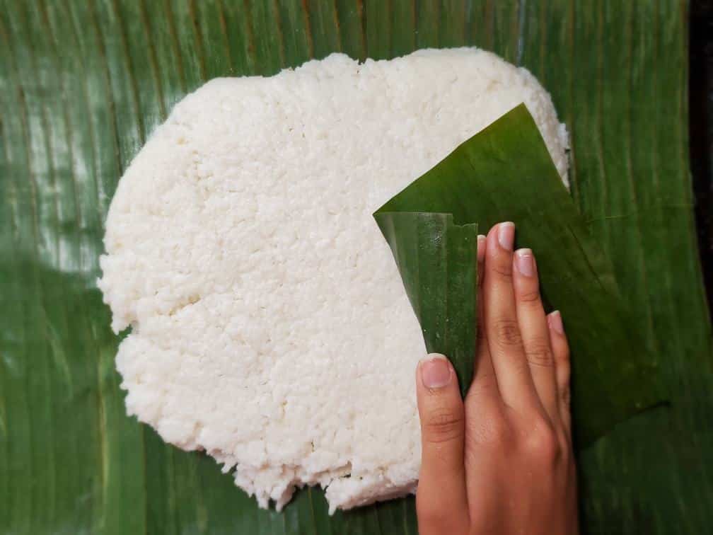• To shape Kiribath, use another piece of banana leaf. If you don’t have a banana leaf, parchment paper, baking paper, a plastic spatula works great too. If your Kiribath sticks to the paper apply a thin coating of oil to the paper you’re using.