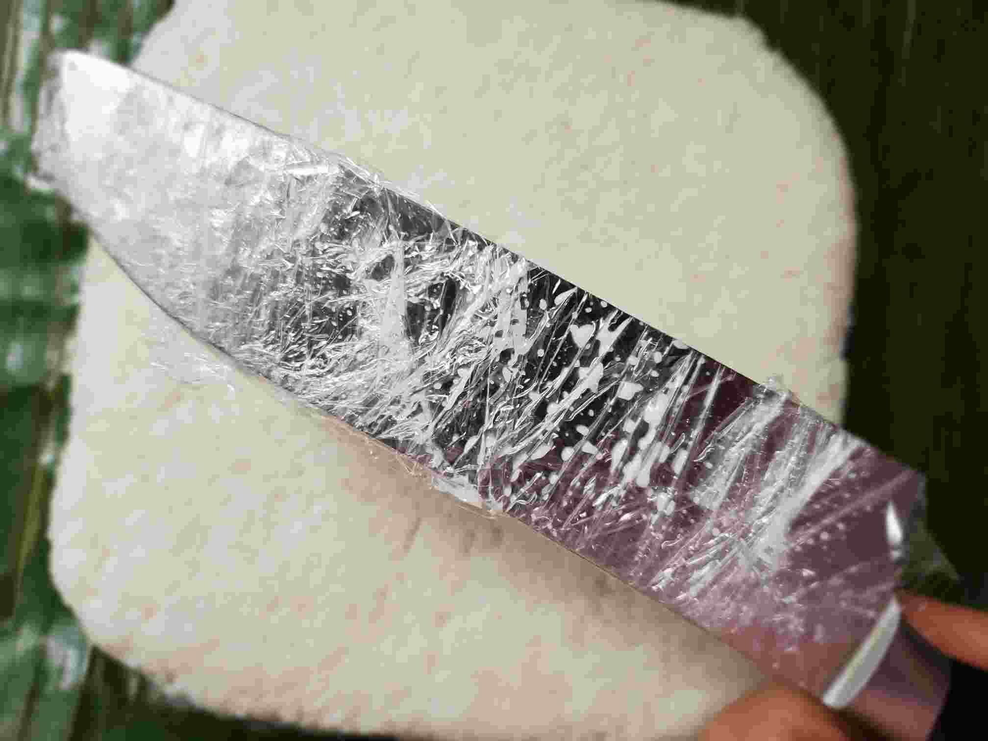 3. Get a knife and wrap the knife with a plastic wrap. And apply a little bit of coconut milk/milk or water so the knife doesn’t stick to the rice.