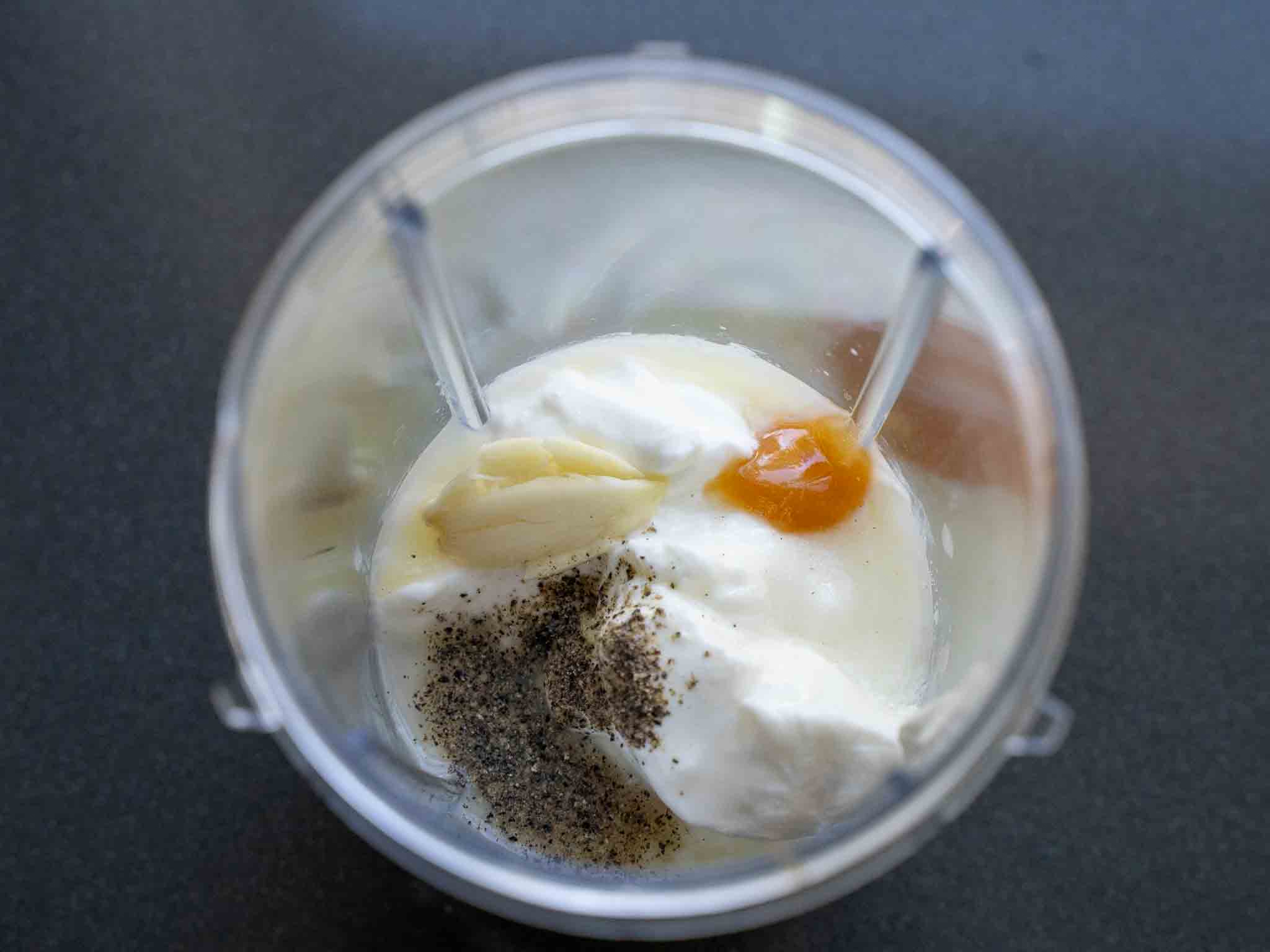 Add yogurt, garlic, lemon, milk, black pepper, salt, and honey into the blender jar and blend for about 15 seconds until everything is mixed well. (Do not blend too much, as the sauce can get too frothy)