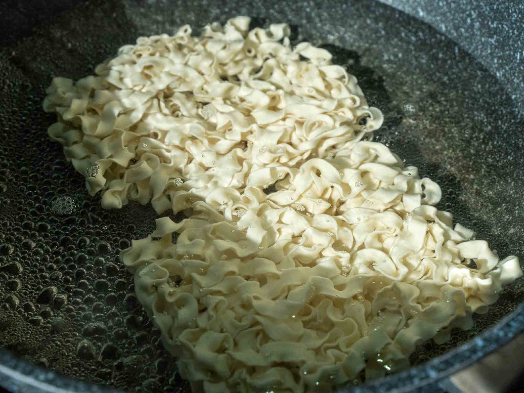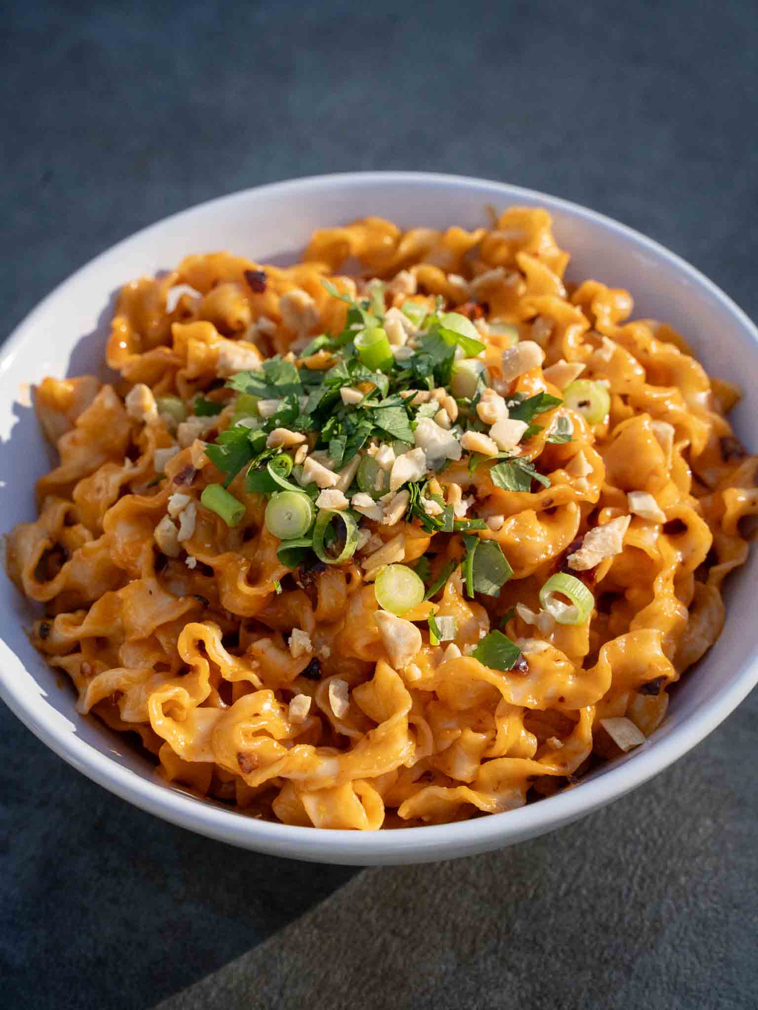 I am a huge fan of using squiggly noodles for these peanut butter chili noodles. Whichever sauce you use, they bind it with so much better than other noodles. You can buy these squiggly noodles from Asian grocery stores, or Trader Joe’s also has squiggly noodles (with a sauce packet too, but I discard it)