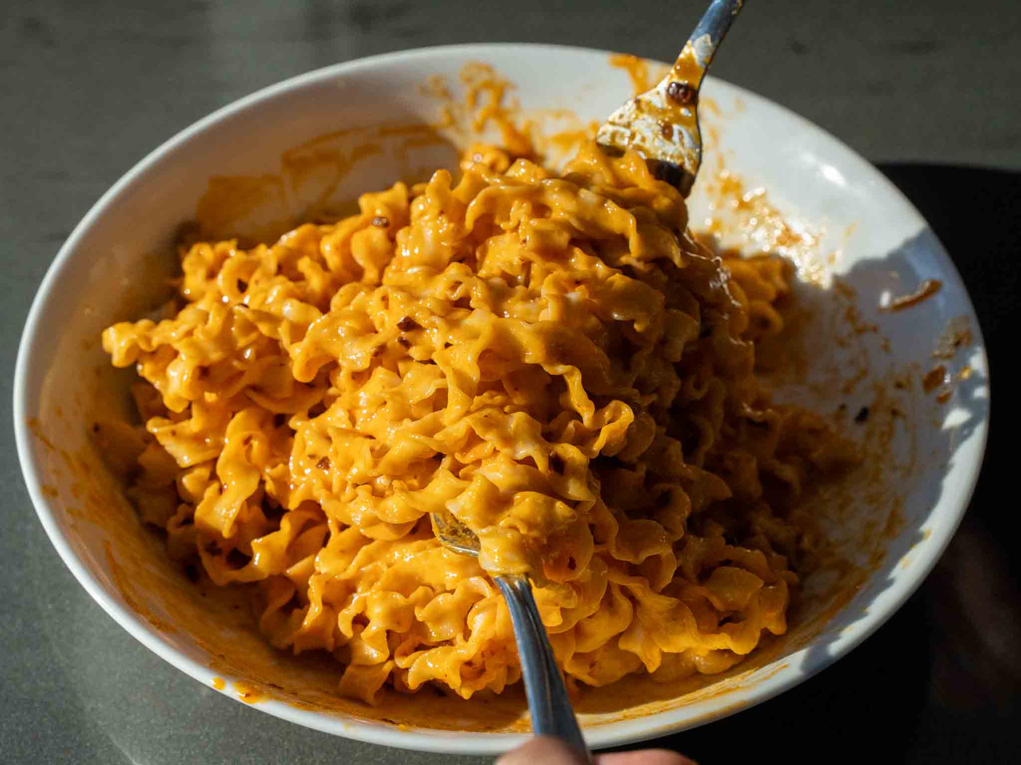3. Drain the noodles. Add the sauce bowl and mix well. (I find it's easy to mix with two forks)