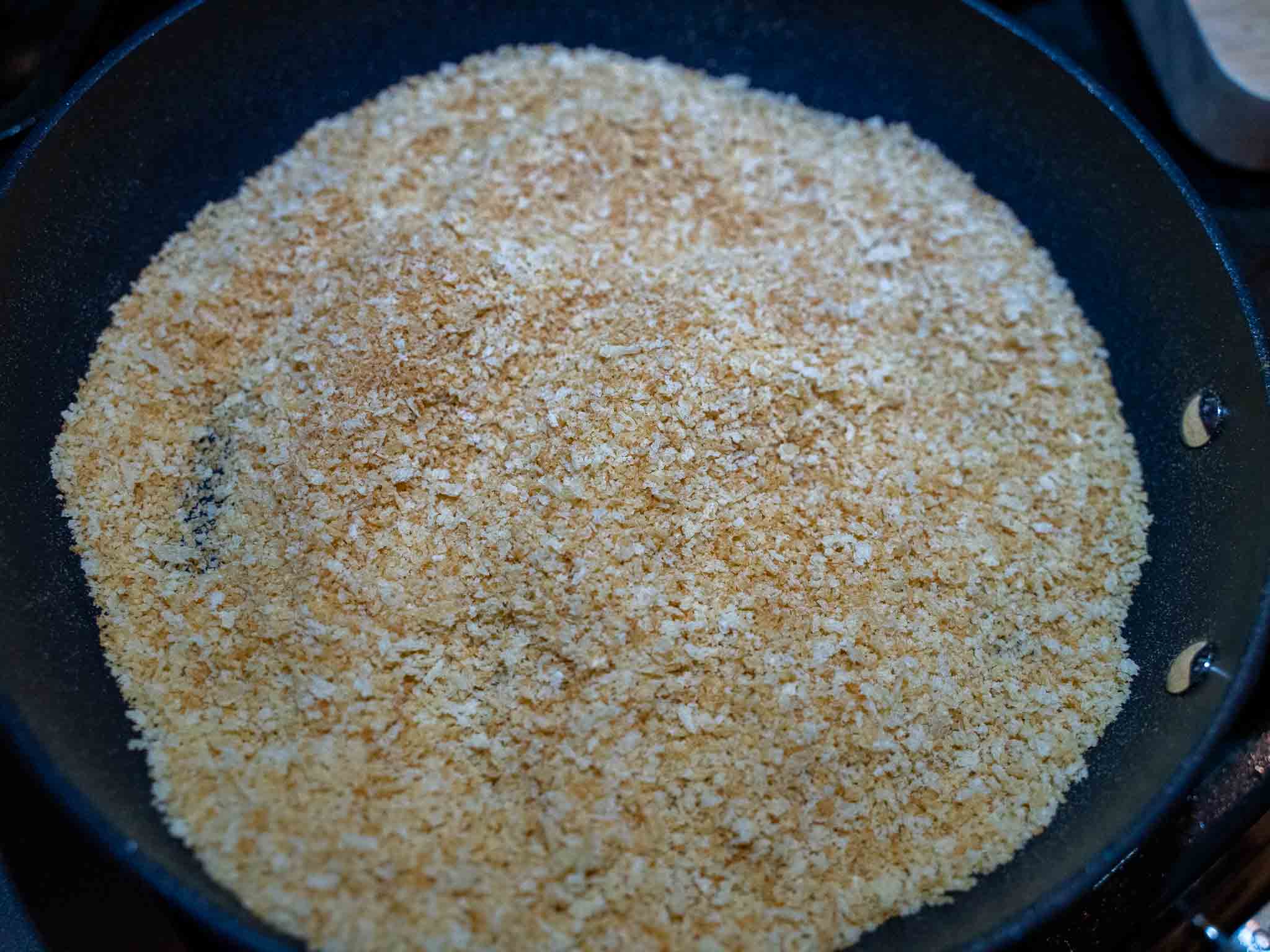 Add panko bread crumbs to a frying pan. Toast them in medium heat (for about 2 minutes) until they turn light golden in color. Stir constantly while cooking. Keep it aside when it's done.