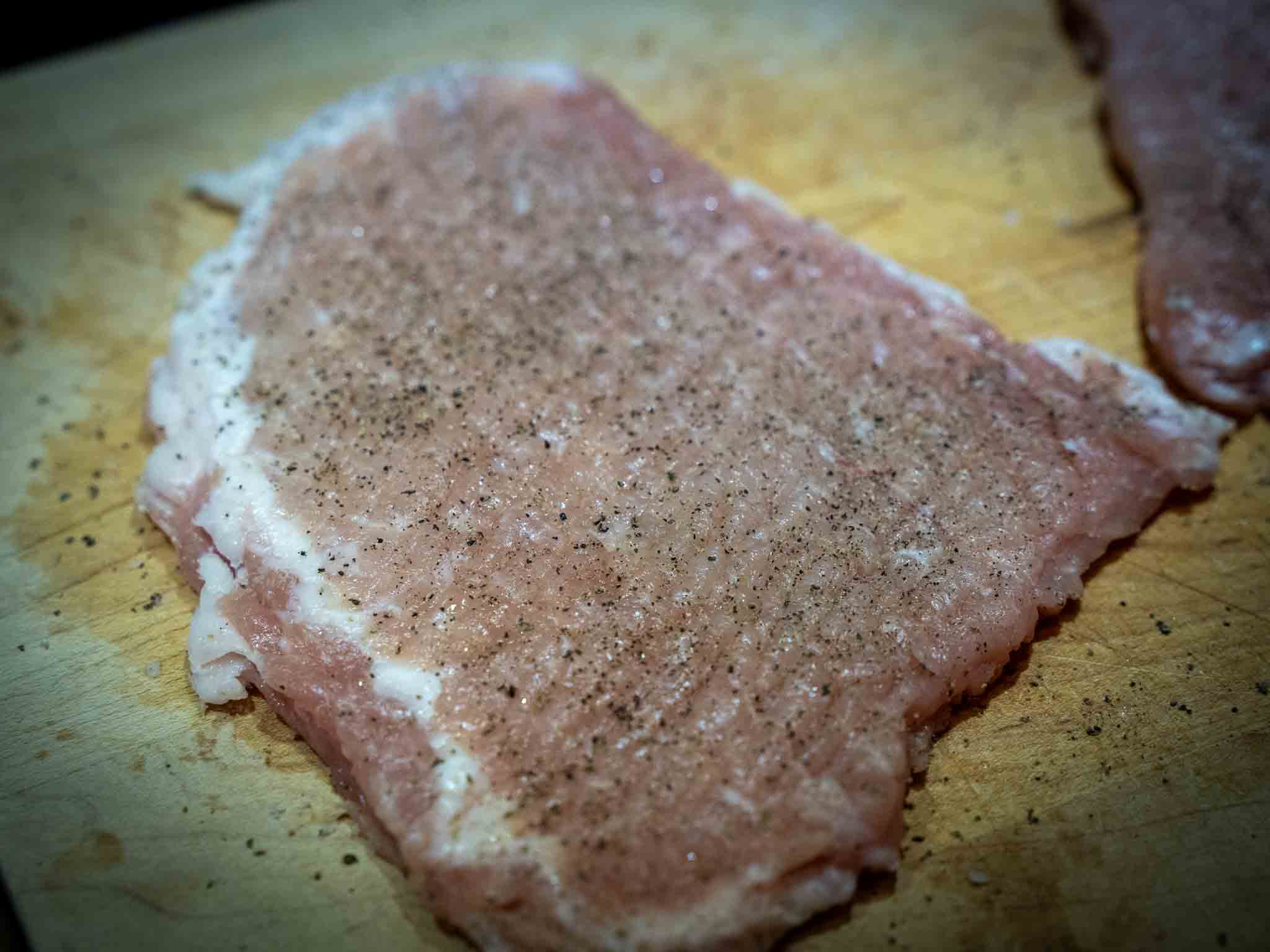 Season generously both sides of the pork chop with salt and pepper.