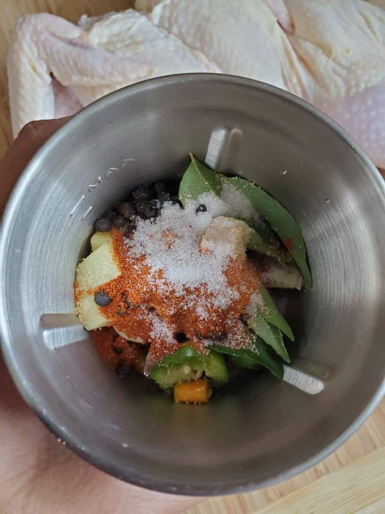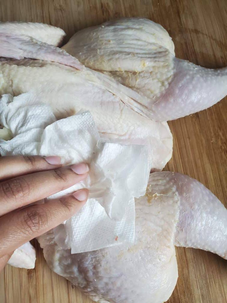 There are some things that would make this chicken even better. If you can thaw the chicken a day earlier, and salt it, you’d notice a huge difference in flavors. The other thing is that your chicken needs to be dry when you rub it with your spice paste. To ensure that you get a nice crispy skin. So buy a dry sealed chicken if you can. Or dab and remove all the water using pepper towels.