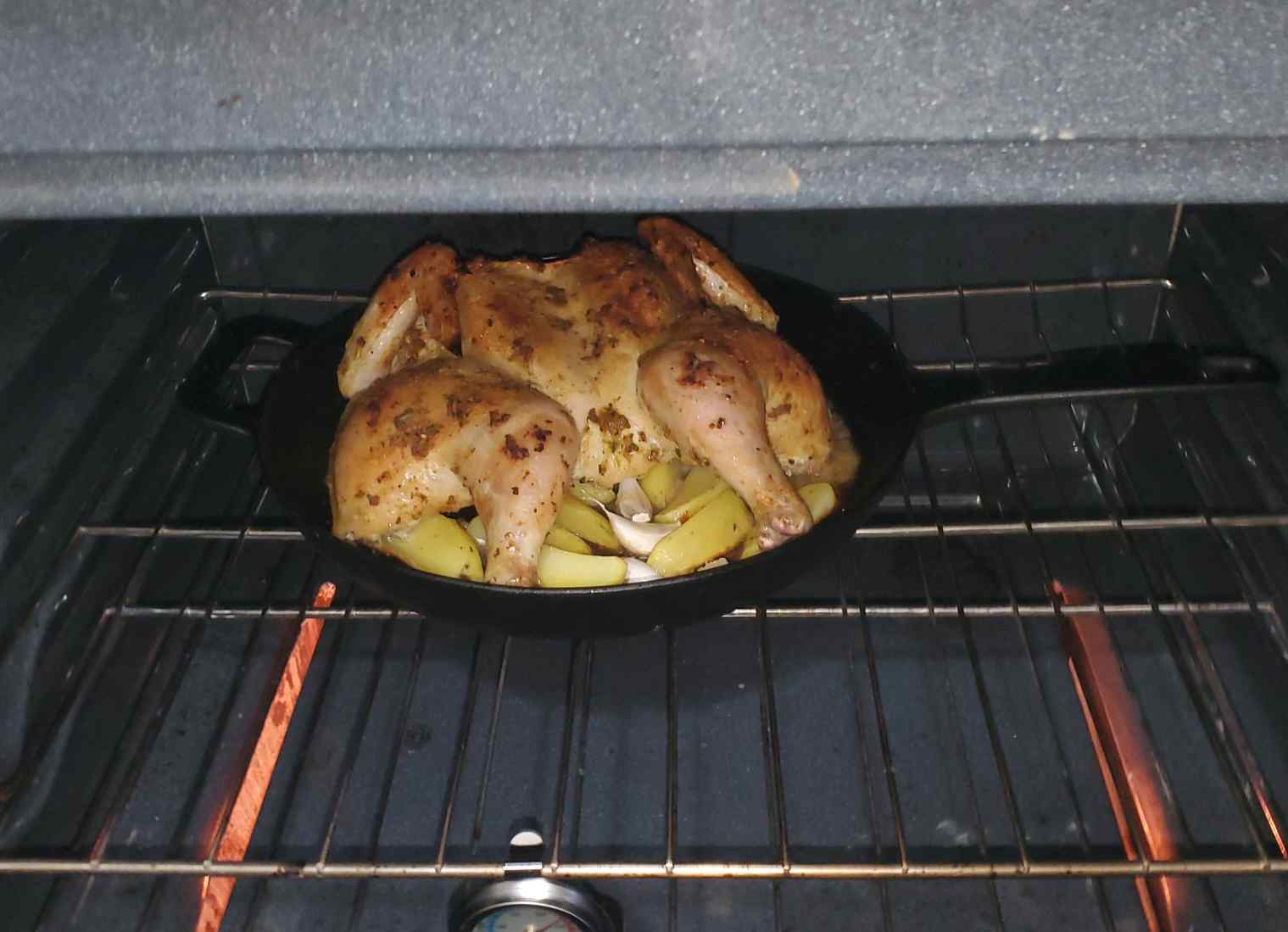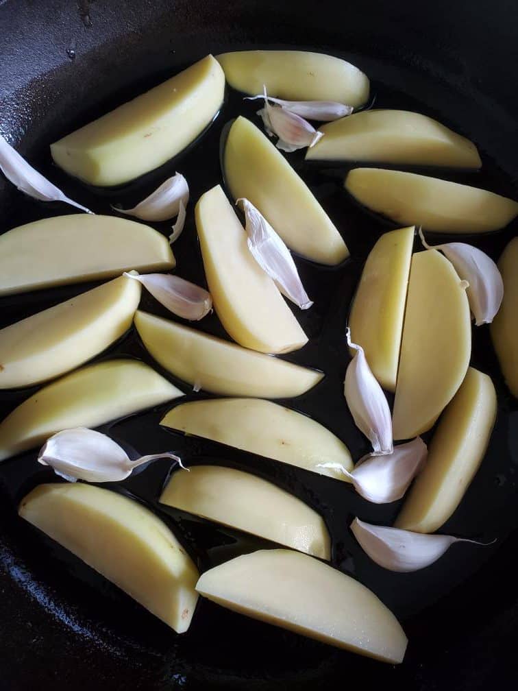 Peel and cut some potatoes. Salt them a little bit and add them to the cast iron skillet. (or any other large baking pan you have). Also, add some unpeeled garlic cloves. Now place the chicken on top of those potatoes.