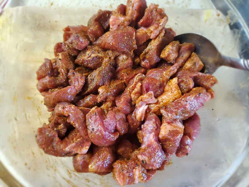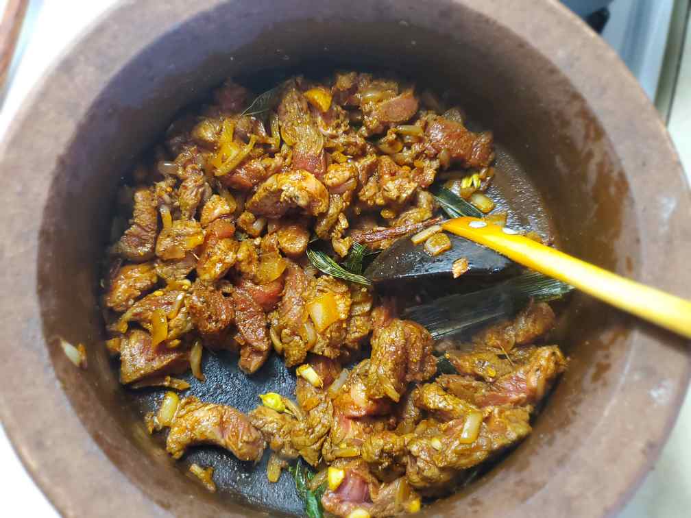 1. Marinade your beef cubes with Sri Lankan roasted curry powder, black pepper powder, turmeric, white vinegar, and a bit of salt. Leave it on the counter while you prep other ingredients. (about 10mins).