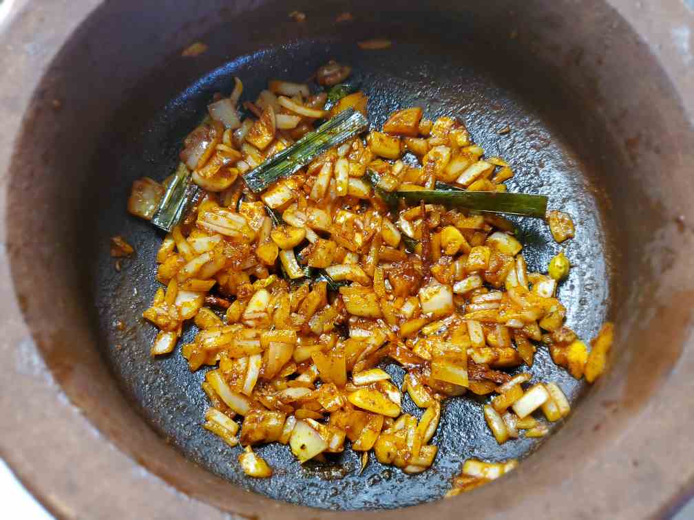 Then add 3 cloves, 3 cardamoms (crush the pods lightly to open them), curry leaves, pandan leaves, cinnamon stick, fenugreek seeds to the oil, and saute for about 30seconds until you get a really good aroma.