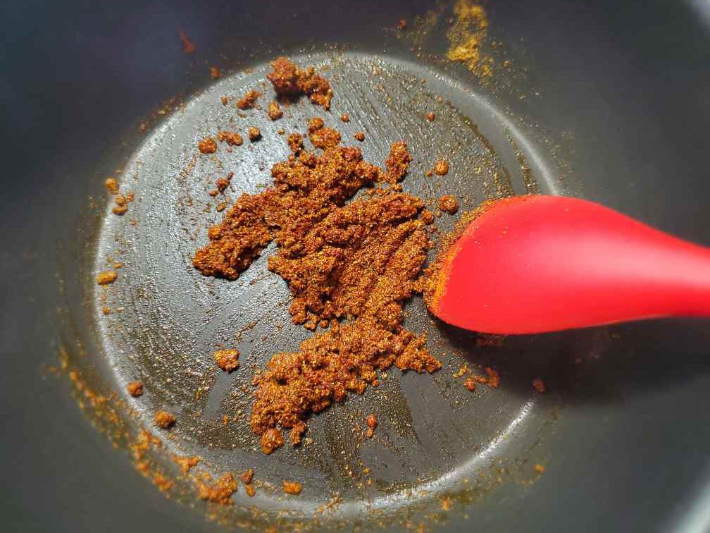 Add some oil into the pan. Add your chili powder first. And then add curry powder, turmeric powder, and ½ tsp of salt. (Do not wait until oil to heat up to add your spice powders.) Slowly roast the spice powders in oil until the oil heats up and you get a nice aroma. Make sure you stir continuously to ensure that spices roast evenly and no burning on the bottom.