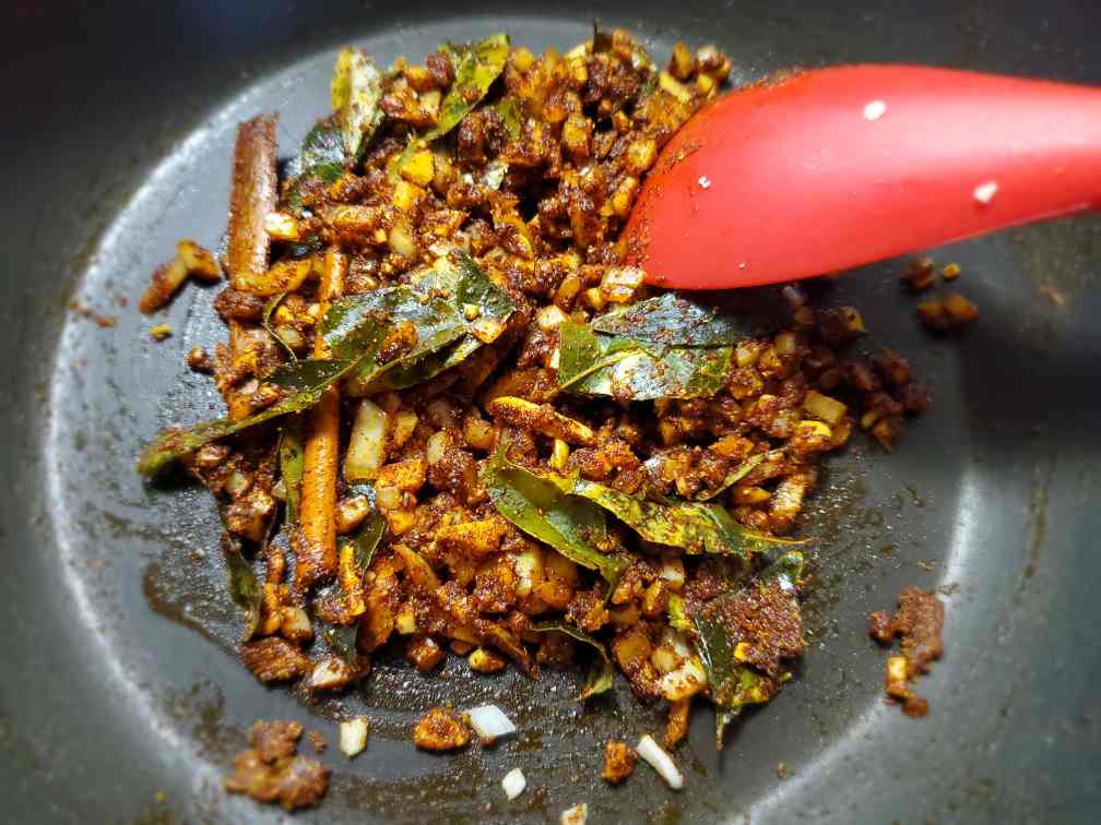 Now add fenugreek seeds, a piece of Garcinia cambogia (goraka), curry leaves, pandan leaves, cinnamon pieces, minced garlic, and finely chopped onion. Sautee the mixture until onions become translucent.