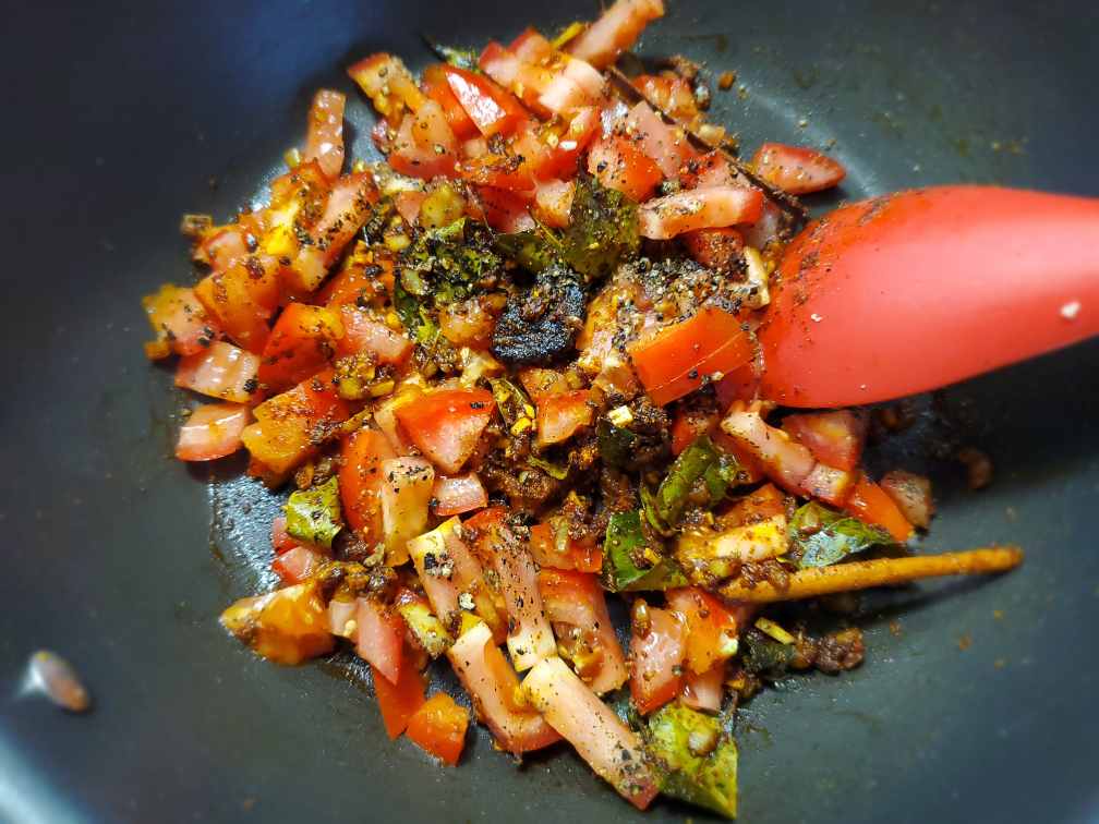 Halfway through cooking down tomatoes, open the lid and mash the tomatoes with the back of your spoon so you won’t get big chunks of tomatoes in the curry.