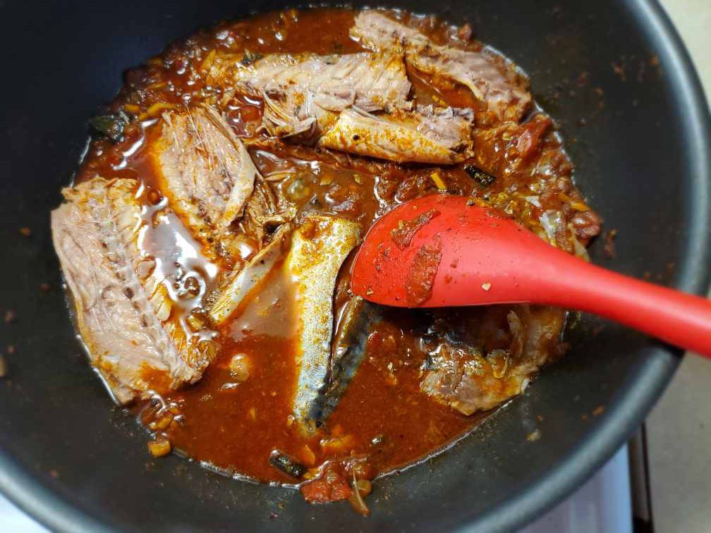 When the tomatoes are nice and mushy and cooked down a little bit, add the can of mackerel along with the liquid inside. (read the recipe description for more info). With a thin-edged spoon or spatula break the mackerel pieces into large chunks. I break 1 piece of mackerel into 4 large chunks. Don’t worry about bones. They are very soft and dissolve into the curry.