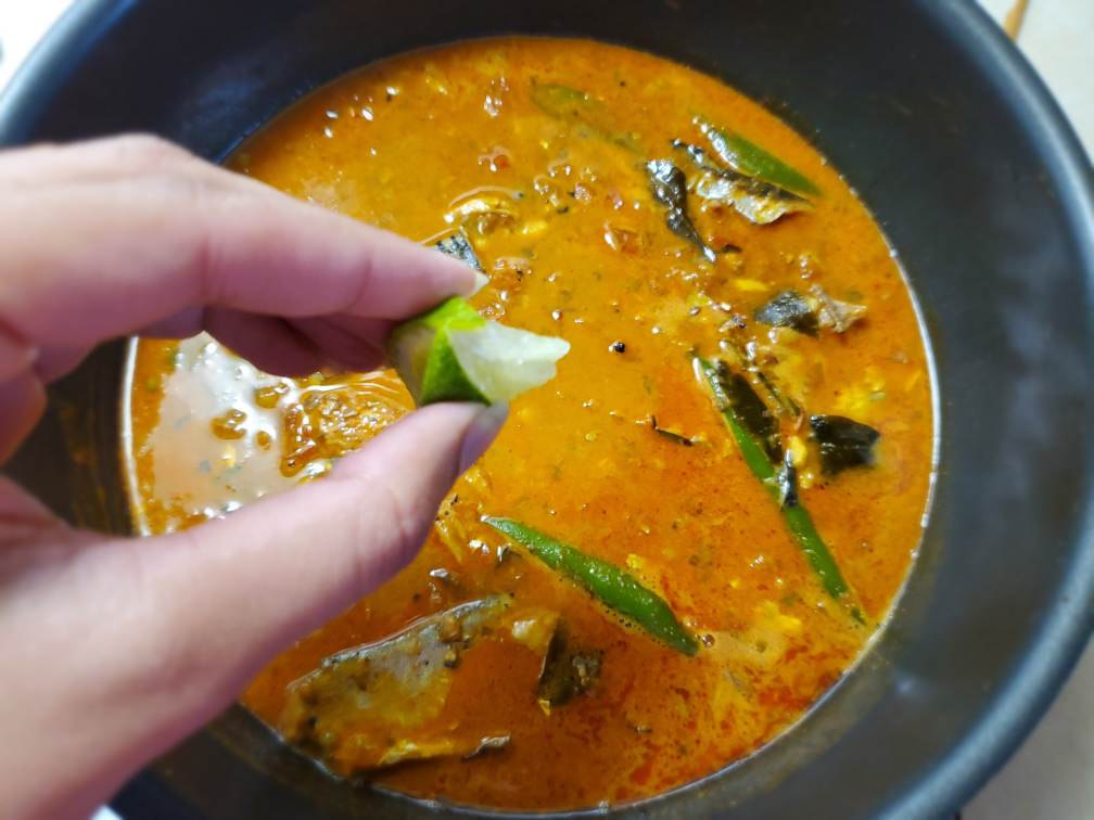 When the curry has reduced to your preferred level, turn off the heat and squeeze a small wedge of lime for freshness. It would turn bright red/orange as the curry cools down and the oil comes on the top.