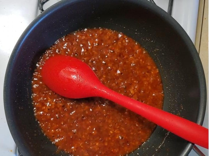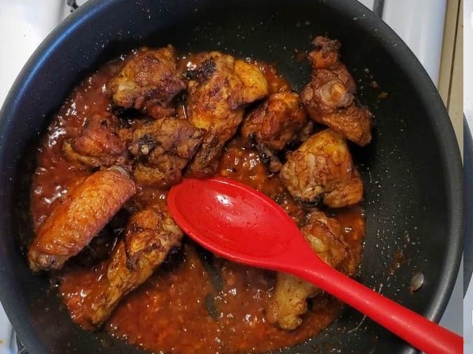 When the sauce is simmering you add sugar. Taste and adjust salt if needed. Then add your fried chicken pieces and mix well.